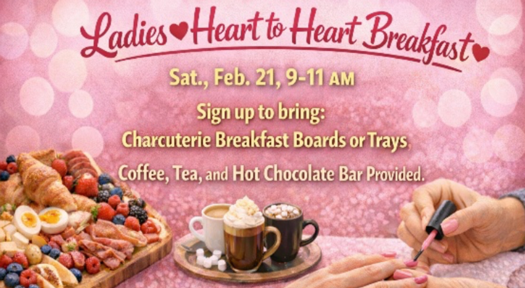 Join us Saturday, February 21, 2026, from 9:00 to 11:00 AM for our Women’s Heart to Heart, including Wise Words for Women. There will also be optional nail painting. Sign up to bring a Breakfast Charcuterie Board.